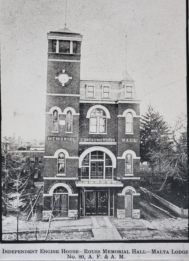 The Firehouse Gallery, located at 108 N. George Street in Charles Town, West Virginia, is housed in the historic C. Broadway Rouss Memorial Hall building. Constructed around 1877, this three-and-a-half-story brick structure showcases Romanesque Revival and Second Empire architectural styles. Notable features include a five-story square tower with an open top supported by round columns and a distinctive hipped roof.